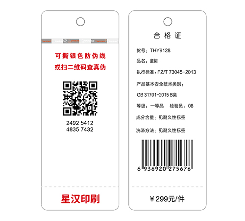 雙線安全線防偽是當前最新防偽技術之一,其安全級別等同與人民幣防偽安全線級別。最大的特點就是安全級別高,防偽效果好,還有就是易于鑒別。其實這一點很重要,因為防偽主要是做給消費者看的,是企業(yè)提供給消費者區(qū)分真假的認知工具,目的是讓消費者不受假冒偽劣產(chǎn)品的蒙蔽。要提高消費者鑒別積極性,提高鑒別率,使主動識別、拒絕、打擊假冒成為可能,那防偽特征就必須能夠讓任何層次的消費者、管理者無需借助任何儀器、工具或支付額外費用都能親自簡單、準確地識別、而且結論準確可靠。因此,安全線防偽技術是當前最好的防偽措施之一。北京星漢特種印刷有限公司將這項技術運用到了收拾吊牌、衣服吊牌中,也受到了客戶的青睞。
